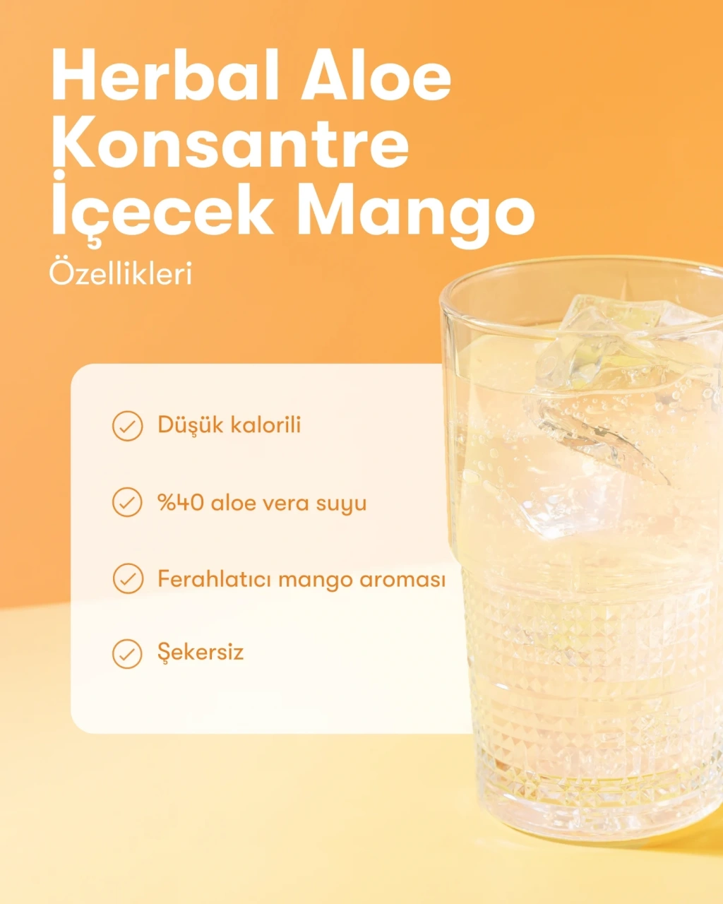 Herbal Aloe Konsantre İçecek, Aloe Vera suyundan elde edilmiş mango aromalı bir içecektir. Ferahlatıcı bir içecek elde etmek için bu düşük kalorili şekersiz konsantre içeceği suyunuza ekleyin.