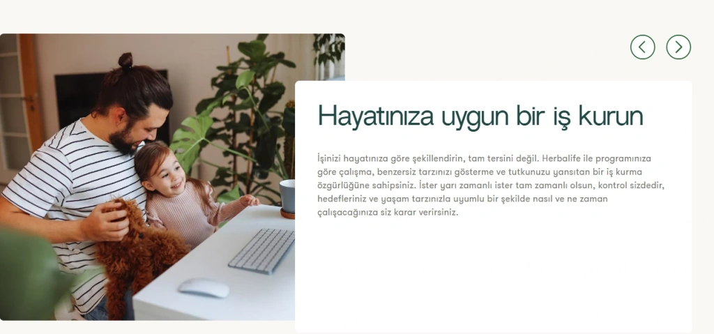 Araçlarımız, teknolojimiz ve zaman içinde test edilmiş doğrudan satış iş modelimizle, dengeli yaşam girişiminize kendi şartlarınızla, kendi hızınızda ve her yerden başlayabilirsiniz. İster fazladan para kazanmak ister başarılı bir iş kurmak isteyin, Herbalife'ta kendi başarı yolunuzu çizme hedeflerinizi destekleyecek kaynaklar, eğitim, mentorluk ve başarılı girişimcilerden oluşan bir topluluk bulacaksınız.