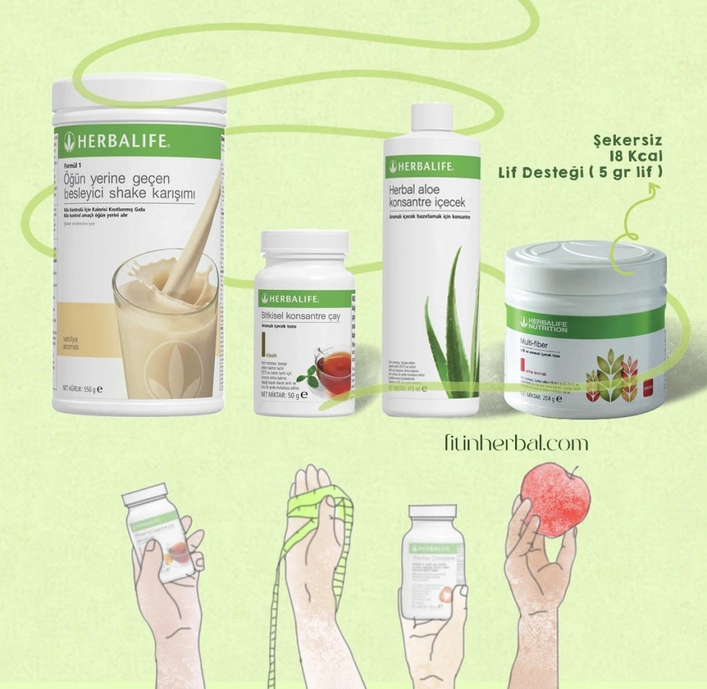 Formül 1 Öğün Yerine Geçen Shake Karışımı , Herbal Aloe Konsantre İçecek, 50 gr Bitkisel Konsantre Çaydan ve Multi-Fiber yeşil elma içecekten oluşan Set.